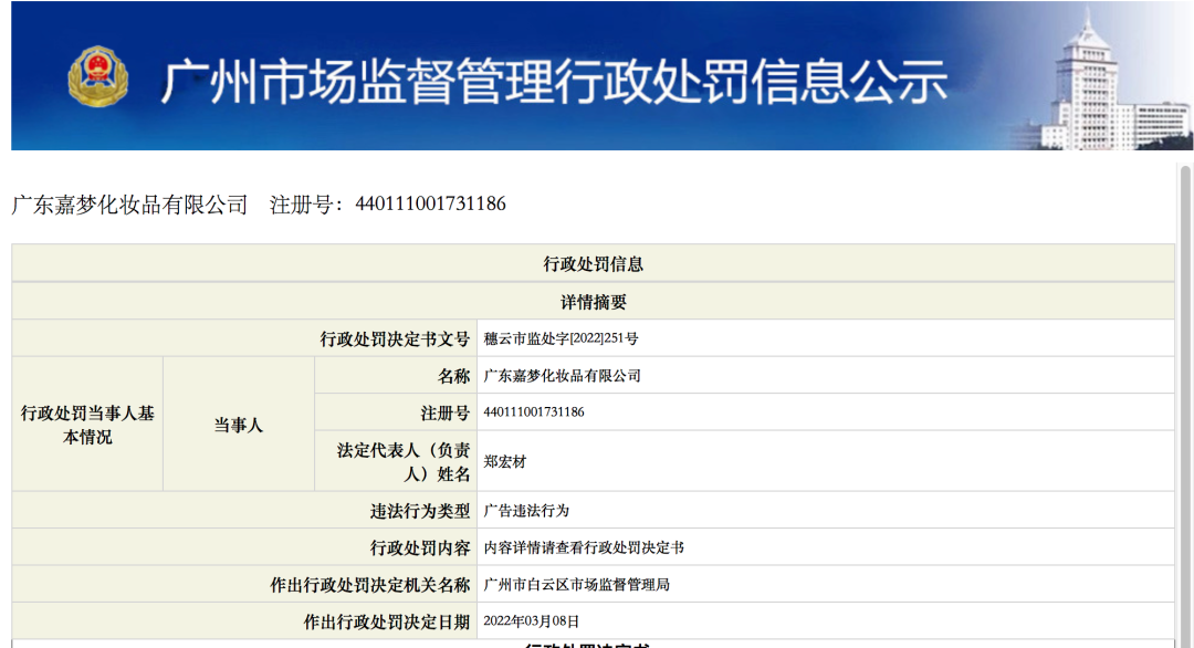 近日,广州市市场监督管理局下发一则《行政处罚决定书》,显示广东嘉梦化妆品有限公司(以下简称“广东嘉梦”)因广告违法行为,被罚20万元。