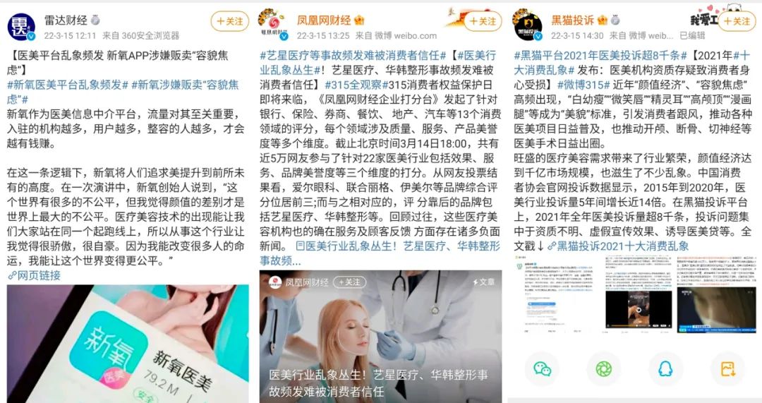实际上,不止晚上的315晚会,今天的微博话题中,与医美行业相关的讨论也非常多。雷达财经、凤凰网财经、黑猫投诉等许多蓝V号都分别发布了与医美行业乱象相关的内容,涉及医美信息平台、医美机构等多个主体,植发、双眼皮等多个医美项目,医美培训、医美贷款、医美产业利益链条等多个方面。