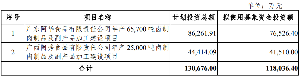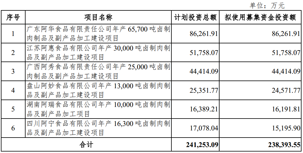 按照原方案,该公司拟募投项目分别是广东年产65,700吨卤制肉制品及副产品加工建设项目(8.63亿元,简称“广东项目”)、江苏年产30,000吨卤制肉制品及副产品加工建设项目(5.18亿元,简称“江苏项目”)、广西年产25,000吨卤制肉制品及副产品加工建设项目(4.44亿元,简称“广西项目”)、盘山年产13,000吨卤制肉制品及副产品加工建设项目(2.46亿元,简称“盘山项目”)、湖南年产10,000吨卤制肉制品及副产品加工项目(1.62亿元,简称“湖南项目”)、四川年产16,300吨卤制肉制品及副产品加工建设项目(1.52亿元,简称“四川项目”)。调整后,该公司只能募投广东项目、广西项目,募投资金无法完全覆盖项目所需投资额,分别缩水至7.65亿元、4.15亿元。