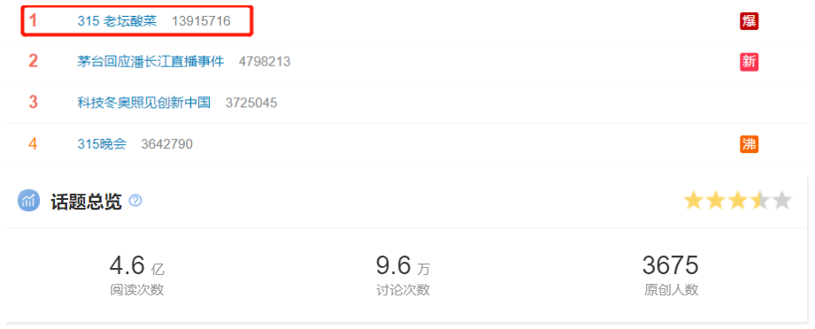节目播出后,“315 老坛酸菜”话题迅速冲上微博热搜榜单第一,并引发了网友大范围的讨论,截至今天下午2点,该话题阅读量已达4.6亿。