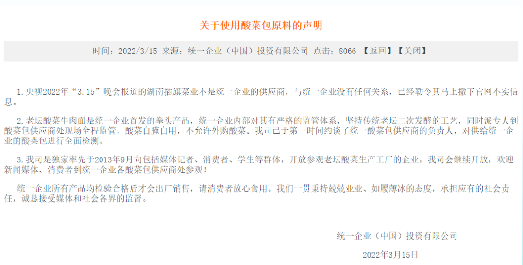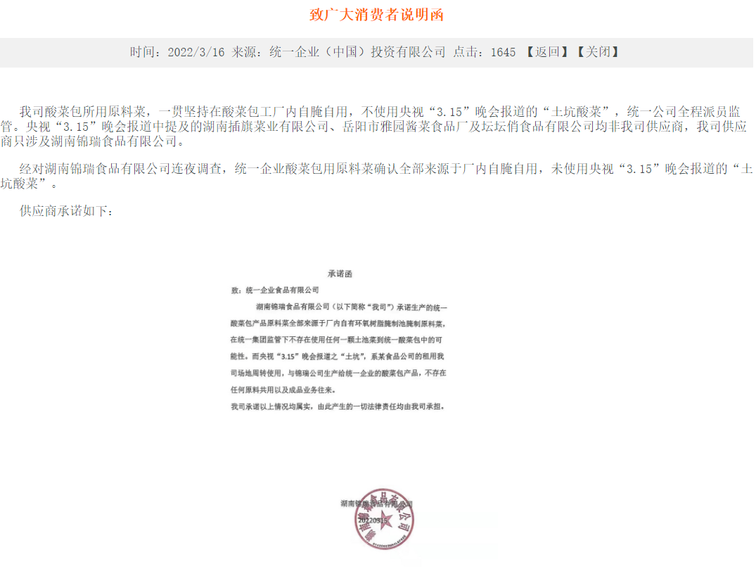在这段时间里,统一也许开展了紧急调查,因为在今天上午,统一又在官网上发表了另一份声明,澄清其使用的酸菜调料包并非央视曝光的“土坑酸菜”,但声明背后却没有任何有力证据支撑,作为今年315的“主角”,统一的准备工作还没有太二酸菜鱼做的到位。