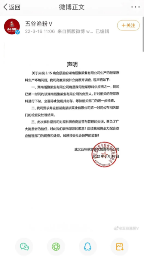 最后是最不着急的五谷渔粉,在众多热心网友的催促下,直至今天上午11点,五谷渔粉才匆忙“抄了个作业”:先承认插旗菜业为其供应商,相关酸菜原材料下架、封存,再要求监督插旗菜业第一时间公布相关部门的检查及处理结果,最后再认个错。除了轻描淡写的声明之外,TOP君实在想问一句,都这样了还不中止合作,是不在乎吗?
