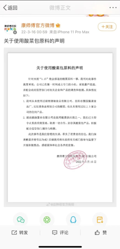 另一个主角康师傅则是在半夜1点发布声明,与统一的思路一致,第一份声明先强调并未与其他三家涉事供应商有任何合作,再承认插旗为其供应商并已取消合作。值得注意的是,康师傅在声明下方关闭了评论,似乎引起了更多愤怒。