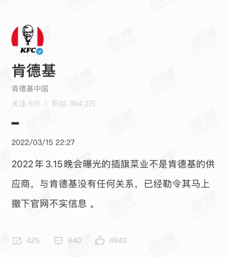 在插旗菜业的官网页面显示肯德基与其建立了合作关系,不过在消息曝出后,肯德基迅速发布微博称其并非品牌供应商,与插旗菜业完全撇清关系;随后,百胜中国也表示二者不存在合作关系,正在联系插旗公司撤下不实信息。