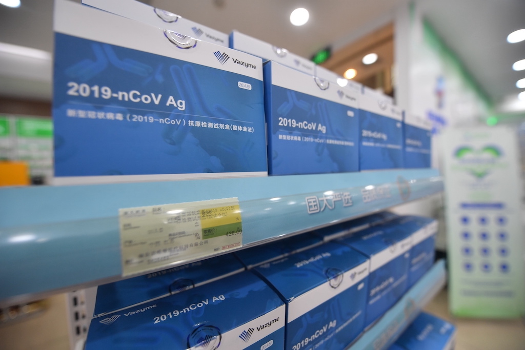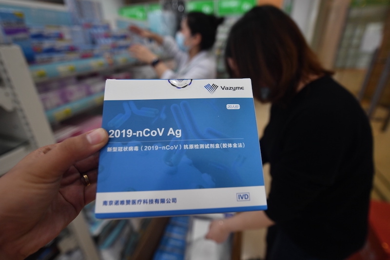 在国大药房南京西路店,首批线下开售的新冠抗原检测试剂盒系南京诺唯赞(Vazyme)生产。单盒20支,每盒价格为428元,需实名购买。