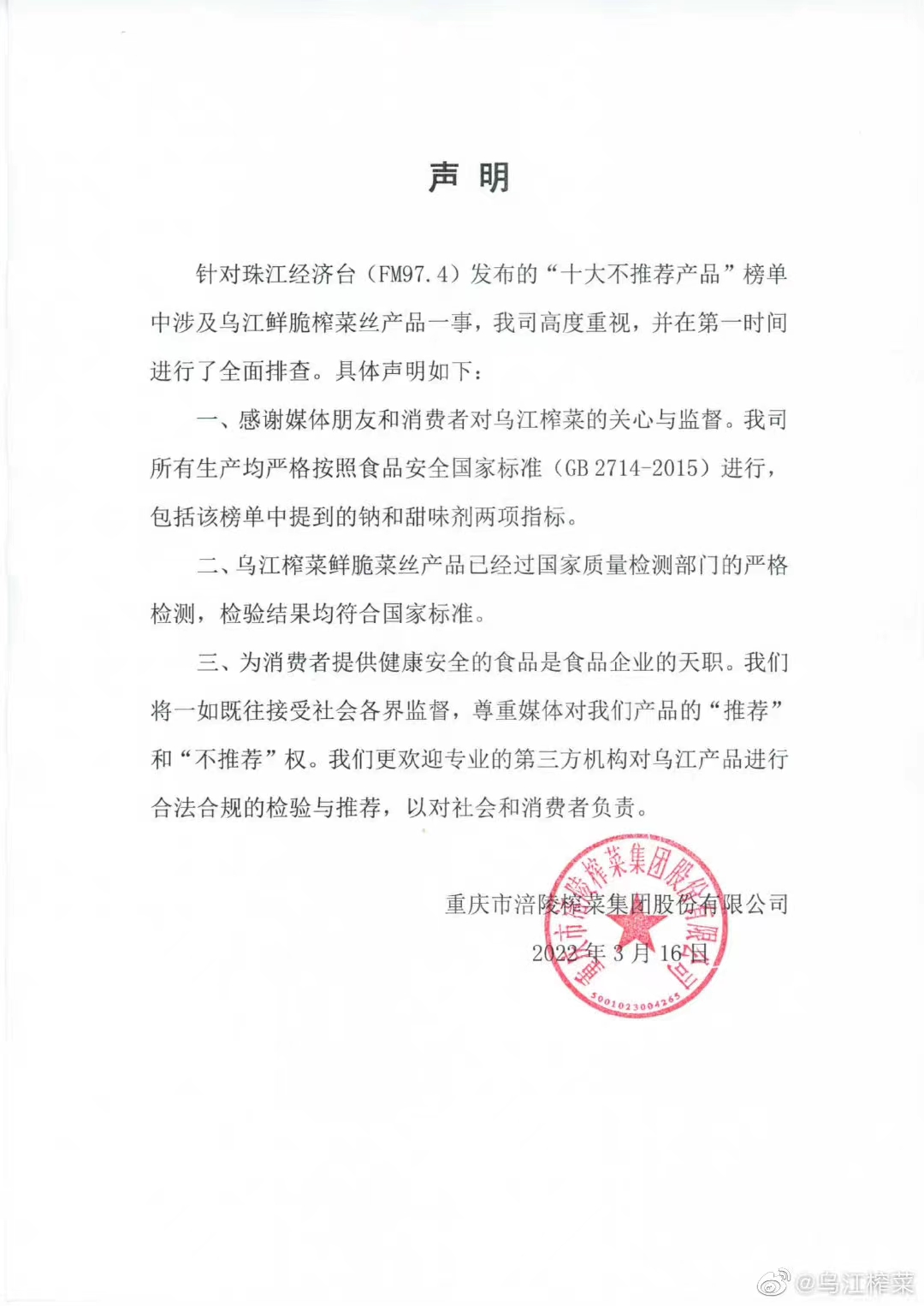 3月16日,@乌江榨菜 发文回应因“钠和甜味剂相对较多”被媒体列入“十大不推荐产品”榜单。公司表示,已在第一时间进行了全面排查,所有生产均严格按照食品安全国家标准进行,乌江榨菜鲜脆菜丝产品已经过国家质量检测部门的严格检测,检验结果均符合国家标准。