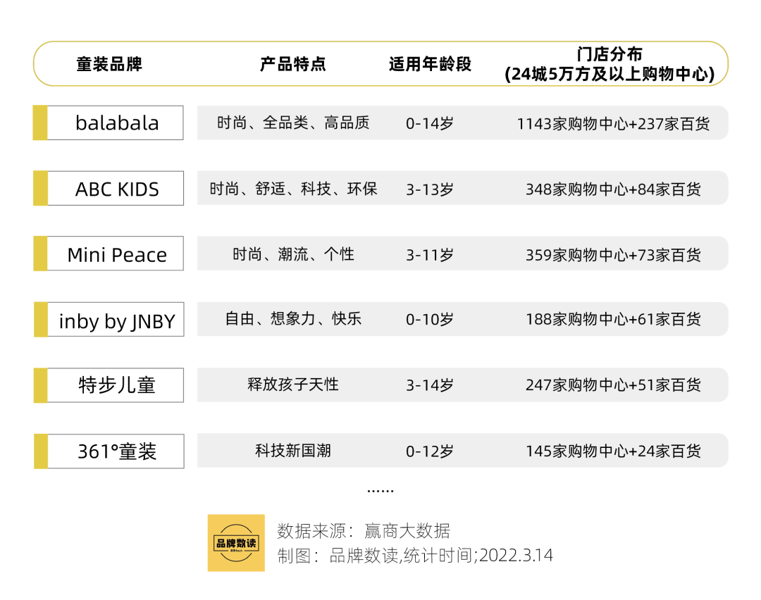 据了解,目前童装行业的主要玩家,包括有森马服饰旗下的balabala、起步股份的ABC KIDS、太平鸟的Mini Peace、江南布衣的inby by JNBY、特步儿童、361°童装,等等。