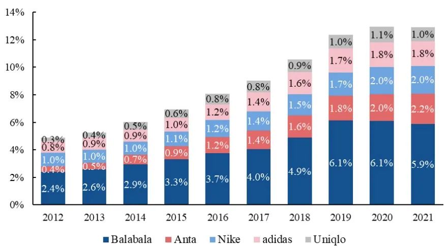 分品类来看,在目前的市场竞争格局里,头部品牌以运动童装品牌为主。除balabala独家领先以外,Nike、安踏、Sketchers、Adidas的市占率也皆达到了3%以上。