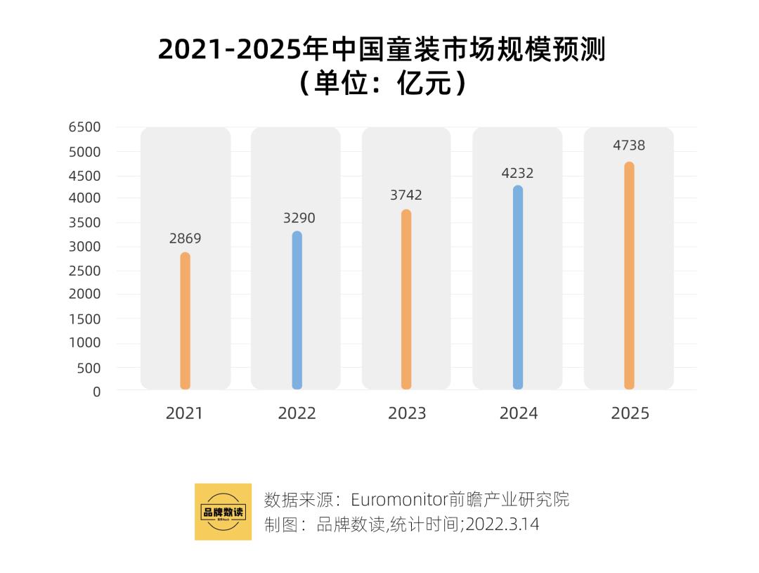 伴随着“二孩”“三孩”政策为出生人数提供支撑、“4+2+1”的家庭结构和“优生优育”的理念提高儿童家庭地位,以及85后、90后新生代消费者愿意为品牌和品质支付更高的溢价,童装市场规模在这些“量”和“价”的双重驱动下,增长空间极具可观。
