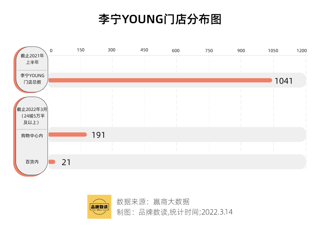 截止2021年上半年,据李宁公司财报统计显示,李宁YOUNG门店总数达1041家。品牌数读(ID:winlive2019)于赢商大数据后台进行检索,在24个城市5万平米及以上购物中心的开店情况里,李宁YOUNG进驻191家购物中心和21家百货,门店遍布26个省份里共59个城市。