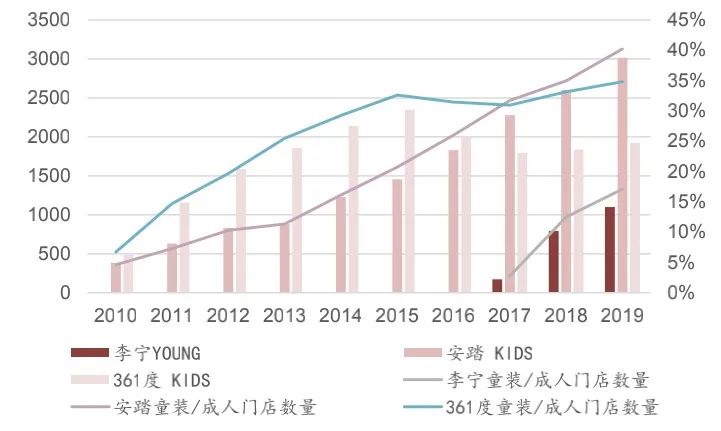 对此,方正证券研究所给出分析:李宁运营能力与安踏接近,以30%计算且假设主品牌不增长,李宁童装业务的收入理论上可超40亿。以主品牌约5700家、儿童门店约2/5计算,李宁YOUNG理论门店数可达2200家左右。