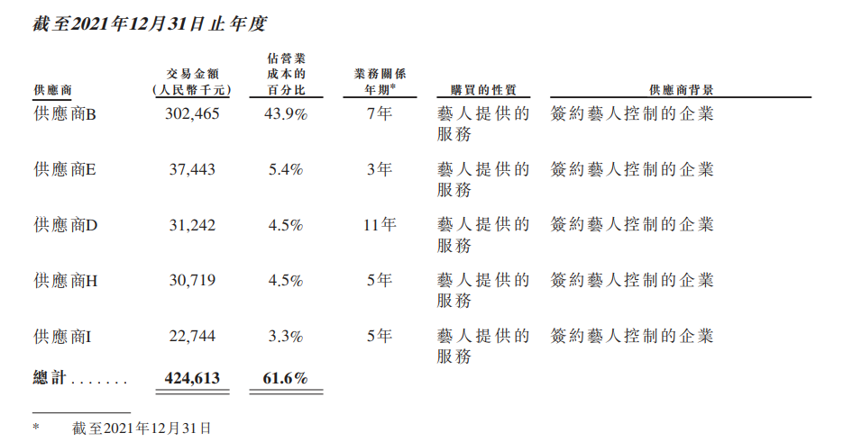 有媒体称乐华娱乐是“王一博概念股”,这更多是从数据层面看到的信息:2021年,乐华的营业成本从2020年的4.29亿增长60.5%至6.89亿。对此,乐华的解释是因为分给艺人的分成更多了(艺人分成于乐华而言是成本,艺人同时也是乐华的内容服务供应商),分成支出从2020年的3.19亿增长至2021年的5.29亿——这其中,根据合作年限及招股书信息推断,供应商B基本可以确定为王一博,而供应商B的交易金额在过去三年从3000万翻到3个亿。换句话说,供应商B是乐华最吸金的艺人、同时也是付出成本最高的艺人。