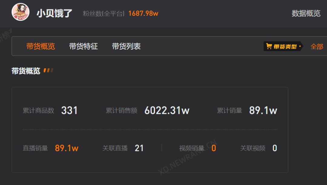 吃播变现真有这么多?我们从同类型主播的带货数据窥得一二:与浪胃仙算得上是同类型吃播的“小贝饿了”粉丝1688万,新榜数据显示,她30日的带货数据已经达到了6022万元。