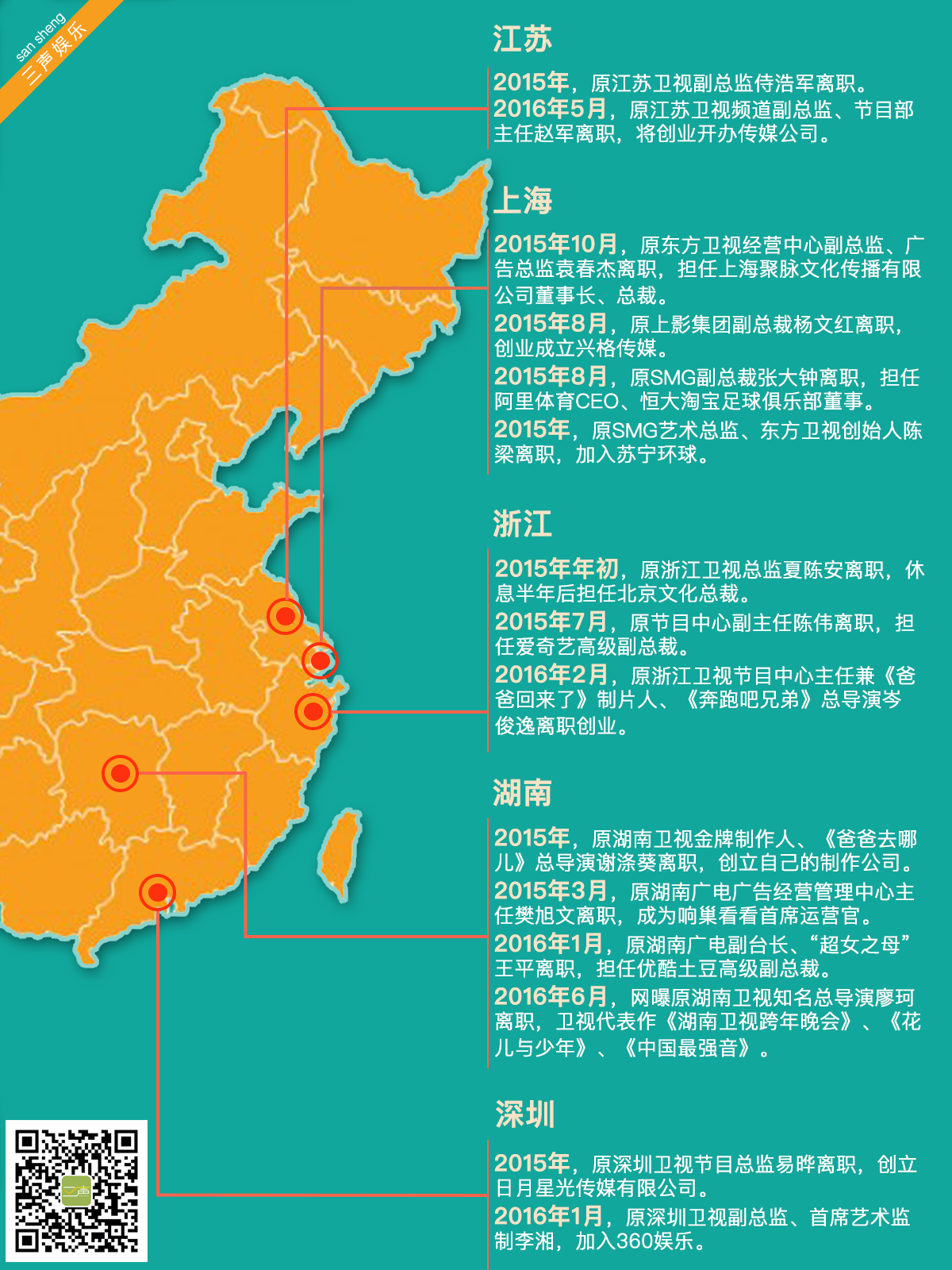 2015年初,夏陈安加盟上市公司北京文化担任总裁一职;6个月后,原浙江卫视节目中心副主任陈伟加盟爱奇艺,担任高级副总裁职务;几个月之后,“跑男”总导演岑俊义离职创业,在拿到来自乐视视频的投资之后建立乐禧传媒。