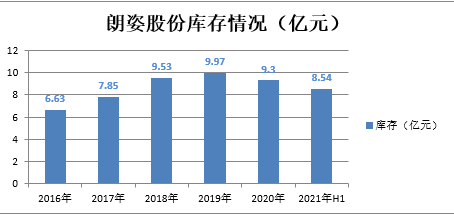 值得注意的是,女装业务仍是朗姿业绩支柱。2017-2021年Q3朗姿股份的女装业务分别营收11.10亿元、13.80亿元、15.12亿元、 13.23亿元,12.15亿元。但是,女装业务的痛点也同样鲜明。2016年至2021年上半年,企业存货分别为6.63亿元、7.85亿元、9.53亿元、9.97亿元、9.3亿元和8.54亿元。