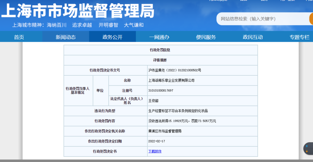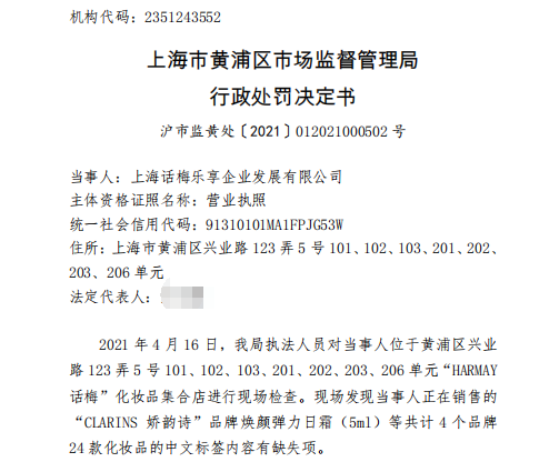《行政处罚决定书》(沪市监黄处〔2022〕012021000502号)显示,2021年 4 月 16 日,上海黄浦区监管局执法人员对上海话梅乐享企业发展有限公司位于黄浦区兴业路123弄5 号 101、102、103、201、202、203、206 单元“HARMAY 话梅”化妆品集合店进行现场检查。