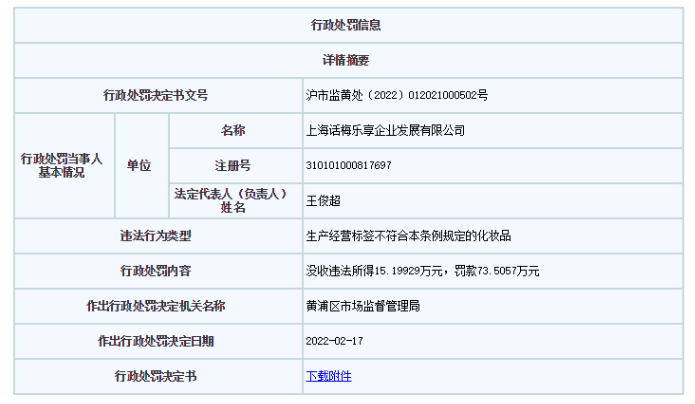 黄浦区市场监督管理局根据《化妆品监督管理条例》第三十五条第一款,“化妆品的最小销售单元应当有标签。标签应当符合相关法律、行政法规、强制性国家标准,内容真实、完整、准确。”,判定该公司构成经营标签不符合规定的化妆品的违规行为,没收违法所得人民币 151992.9元,罚款人民币735057元,共计罚没88.7万余元。