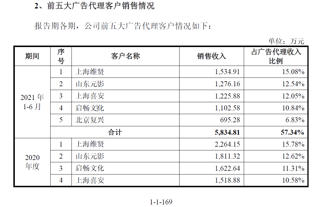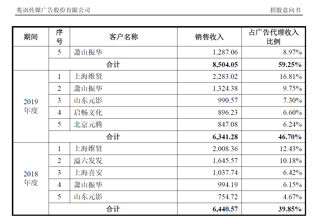 2018年到2021年上半年,上海维贤一直是兆讯传媒的第一大广告代理客户,分别贡献销售收入2,008.36万元、2,283.02万元、2,264.15万元、1,534.91万元,合计金额8,090.44万元。