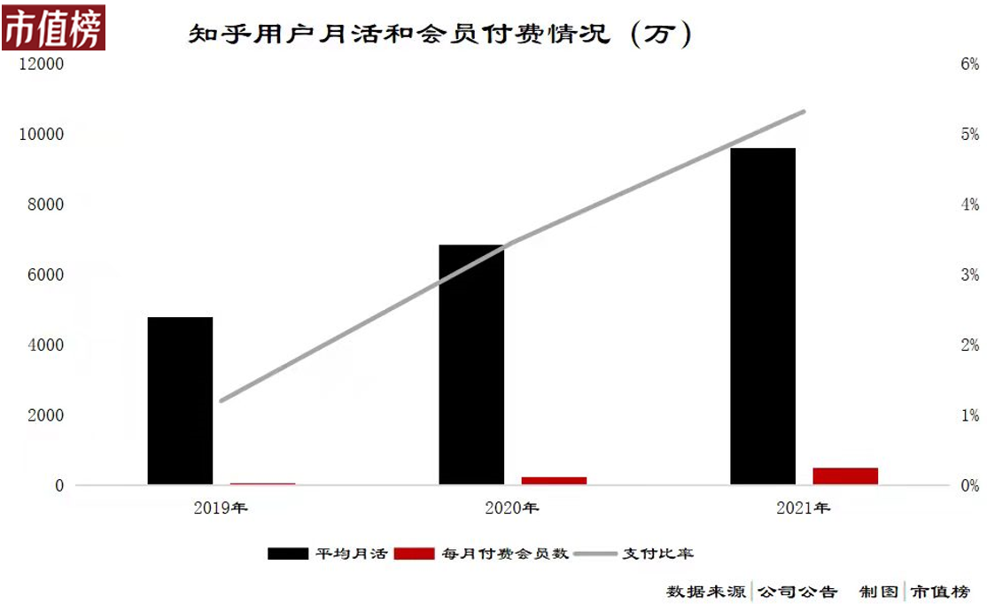 两个增速的对比可以看出,知乎会员的转化率在提升。落到数据上,会员支付比率从2019年的1.2%,增长至2020年的3.4%。到2021年第四季度,支付比率上升为5.9%。