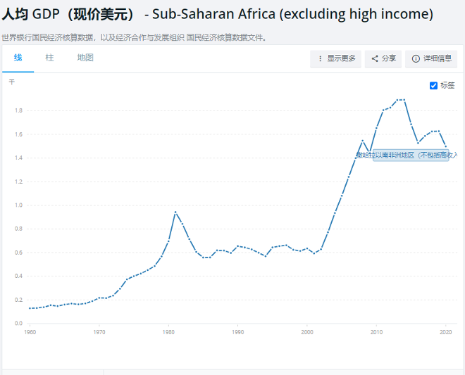 世界银行数据,2020年撒哈拉以南非洲地区(不包括高收入)的人均GDP只有1498.6美元,而中国人均GDP为1.05万美元。
