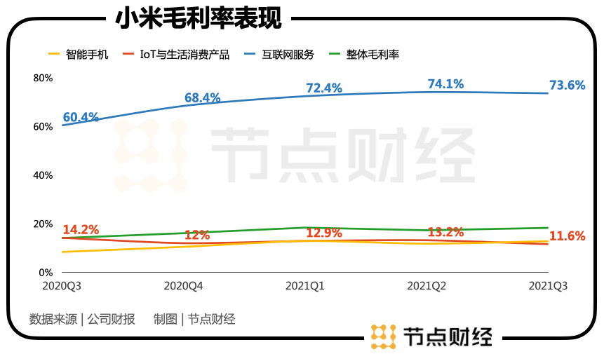 体现到业绩上,小米的互联网服务业务小米三大业务中毛利最高的,近三个季均在70%以上,同期收入规模在70亿元左右。而对身为第一大业务的智能手机业务来说,10%左右的毛利率就已经算是高水平了。
