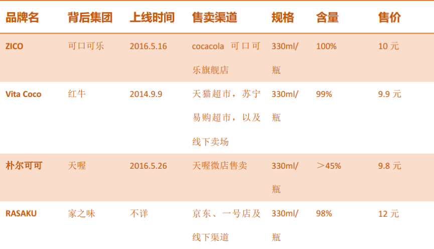 早在2012年,可口可乐就并购了美国第二椰子水品牌ZICO,并于今年5月中旬在中国上线,专供天猫旗舰店。看到这一市场的前景,天喔紧随其后推出了椰子水新品朴尔可可,红牛则更早一步,在2014年并购了Vita Coco 25%的股份后,去年就引进了中国。