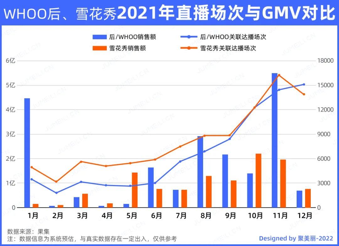据果集发布的《2021直播电商年度数据报告》显示,去年一年在抖音快手两大平台中,WHOO后护肤套装直播销售额超27亿元,雪花秀护肤套装直播销售额超13亿元。