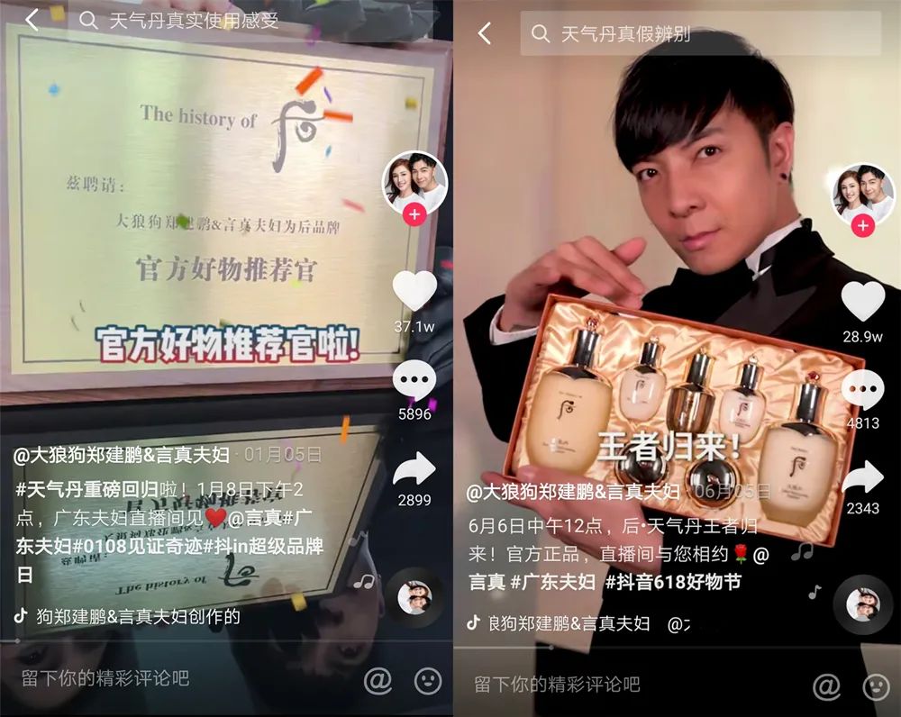 “而广东夫妇在抖音成功塑造了一个‘广东有钱夫妇’的人设,已经形成了自己的口碑。他的粉丝受众很大一部分是已婚的居家女性,消费水平高,与WHOO后本身的购买人群匹配度特别高。品牌选择与广东夫妇深度捆绑,类似一些国货彩妆在淘宝与李佳琦的深度合作。”