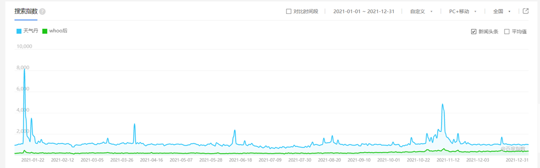 而从百度指数趋势图也可以看出,WHOO后的天气丹,在消费者端的认知度和热度是远远高于WHOO后品牌本身的。2021年“天气丹”的搜索指数一直是远超于“WHOO后”品牌。其搜索指数在1月上旬达到了全年的峰值,正是WHOO后正式入驻抖音的前后。此外38、618、818、双11等时间点,天气丹的热度都达到了一个峰值。