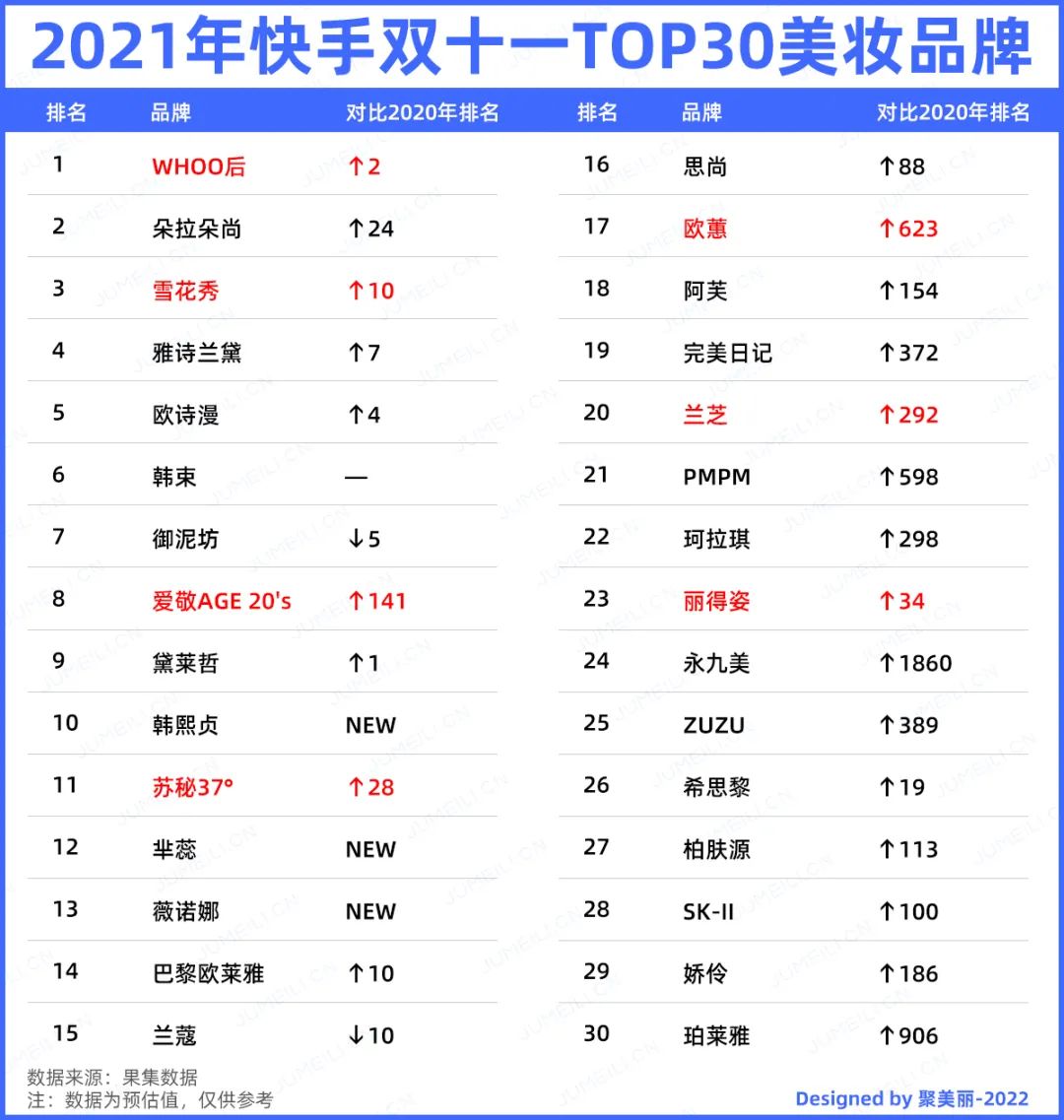 而在果集推出的《2021年双11抖快美妆行业社媒电商报告》中也指出:2021年快手双十一TOP30的榜单中,有7个韩妆品牌。其中WHOO后、雪花秀、爱敬、苏秘37°、欧蕙、兰芝、丽得姿,分别位列销售额榜的第1、第3、第8、第11、第17、第20位以及第23位。其中欧蕙与2020年双11相比排名大幅上涨了623位,兰芝、爱敬等的涨幅也在100名以上。