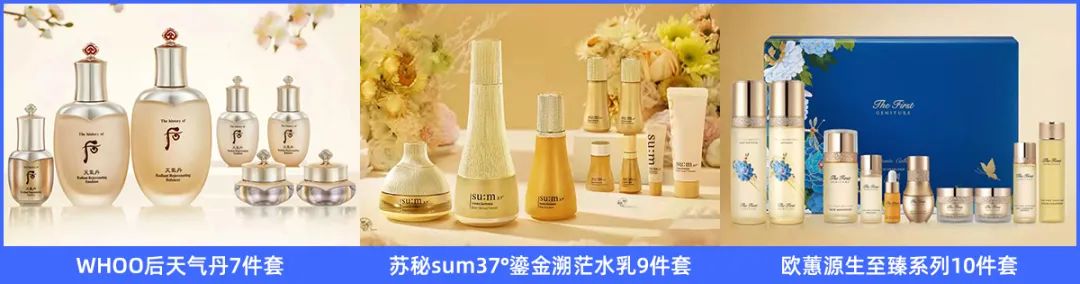 比如WHOO后的天气丹花献光彩紧颜系列、雪花秀滋盈肌本护肤礼盒、爱敬的钻石气垫、欧蕙源生至臻系列礼盒、兰芝隔离霜、苏秘sum37°鎏金溯茫水乳礼盒等,皆是这些品牌一直以来的主打产品,也是各大电商直播间的常客。