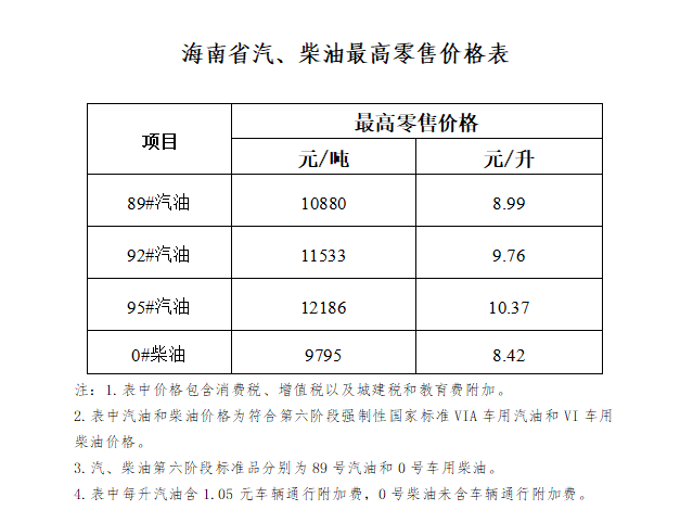 根据国家发展改革委官网新闻发布中心3月17日公布的国内成品油价格调价信息,国内汽、柴油价格(标准品)每吨分别提高750元和720元。海南省发展改革委按照现行成品油价格形成机制调整我省汽、柴油最高零售价格,自2022年3月17日24时起执行。调整后,92号汽油9.76元/升,95号汽油10.37元/升,0号柴油8.42元/升,每升分别上调0.60元、0.64元、0.62元。