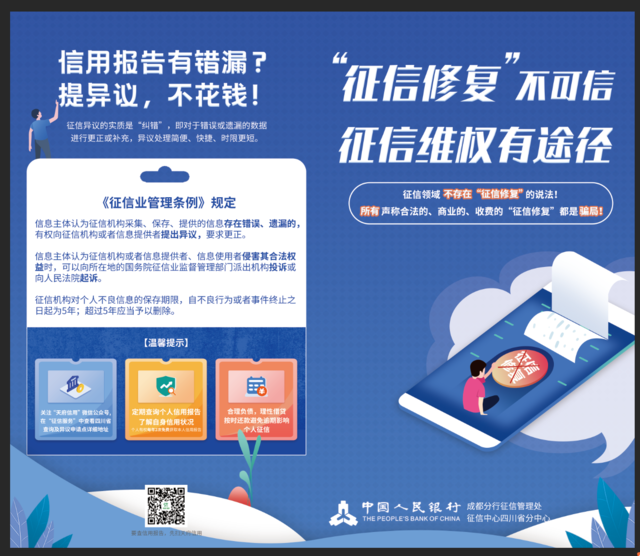 “征信领域不存在‘征信修复’的说法。所有声称合法的、商业的、收费的‘征信修复’都是骗局!”3月17日,在中国人民银行成都分行2022年一季度新闻发布会上,征信管理处处长苏萍郑重地提醒广大市民,任何机构或个人都不可能随意删除、修改征信记录。