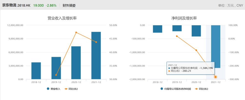 招股书及近期财报数据显示,2018年至2021年,京东物流营收均保持40%以上的增长速度,但亏损同样与日剧增,分别亏损22.34亿元、41.34亿元、158.42亿元,2021年净利润同比下降283%。