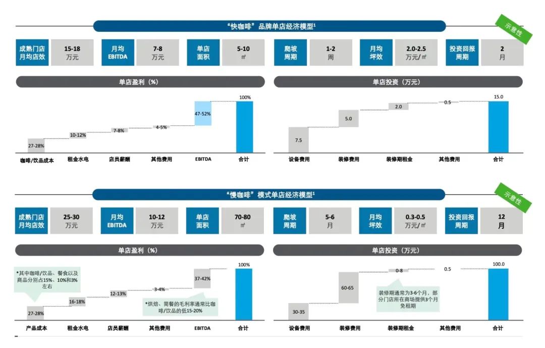 前者更重视获取便捷性和价格,后者更重视品牌调性和环境配套,这也导致了两种场景的成本模型不同。根据德勤报告对比来看,快咖啡场景月均坪效为2.0-2.5万元/m2,投资回报周期为2个月;慢咖啡场景月均坪效为0.3-0.5万元/m2,投资回报周期也拉长为12个月。