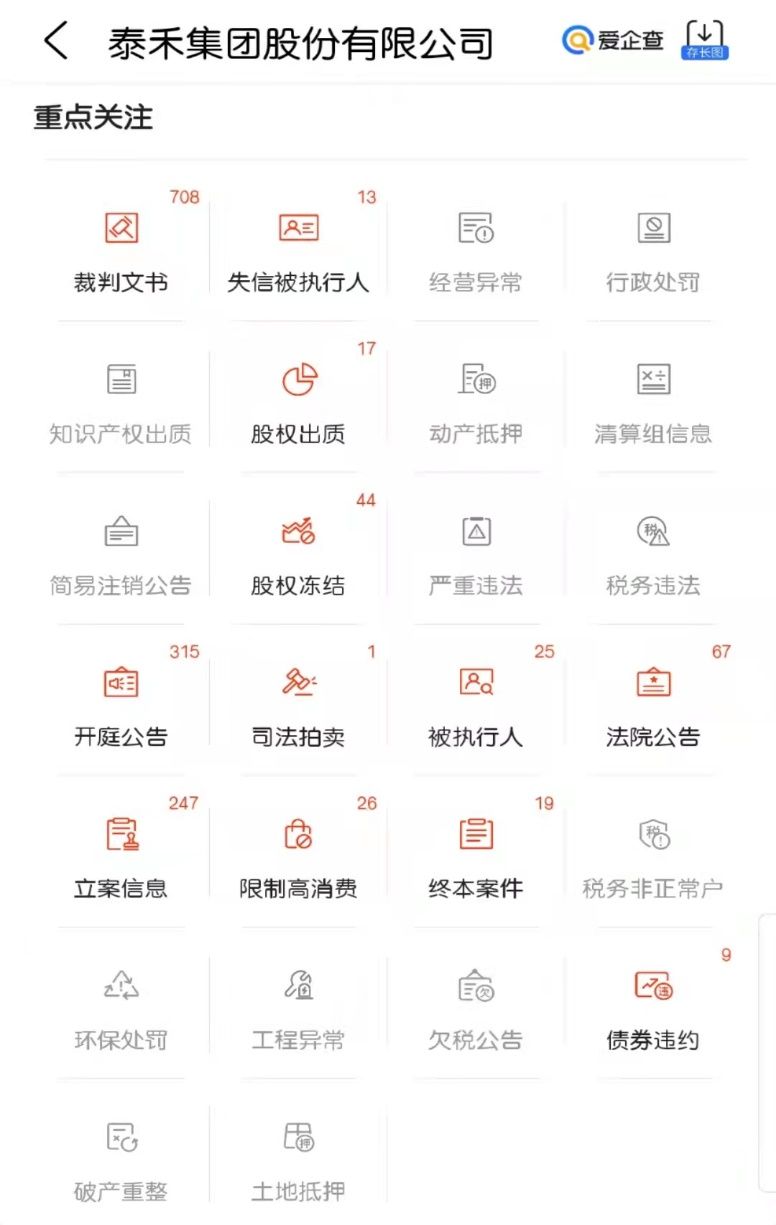 据爱企查显示,截至目前,泰禾集团累计被申请冻结股权44次(7次已解冻)。此外,由于多次陷入债务纠纷,泰禾集团及实控人黄其森也多次被列为失信被执行人,并限制高消费。
