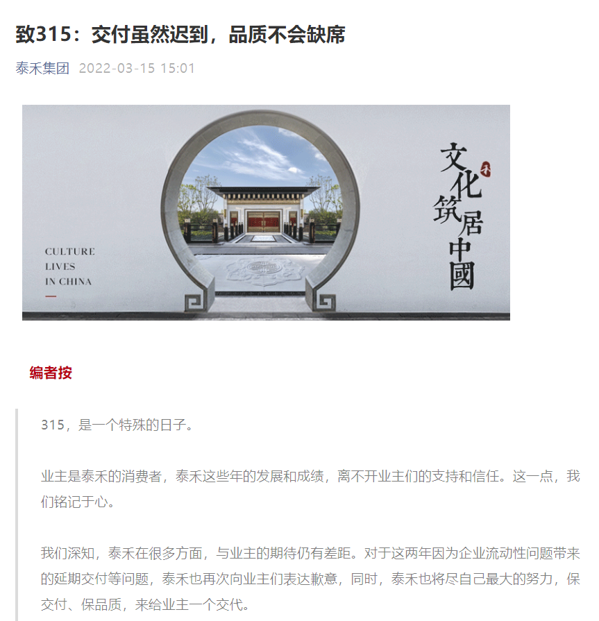 3月15日,泰禾集团官微发布文章《致315:交付虽然迟到,品质不会缺席》表示,2021年,泰禾积极自救,取得了复工复产的明显进展。2022年,“复工复产,保交付、保品质”仍是泰禾最大的策略。