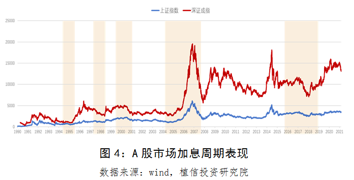 从A股市场历史表现来看,美联储加息周期对A股市场走势的影响有限。由于中国央行对于跨境资本流动采取了主动管理机制,并且中美国债收益率长期保持了较为明显的利差,因此美联储加息周期可能产生的资本流动效应在A股市场体现得并不明显。2004年-2006年美联储加息周期中间诞生的波澜壮阔的牛市行情,以及2015年-2018年加息周期中A股市场整体的低迷走势都是国内经济和金融因素促成,和美联储加息关联度较低。