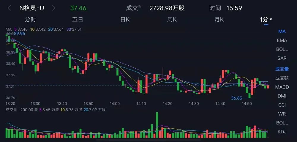 格灵深瞳开盘价为38元/股,随后股价有所下调,最低至34.3元/股。截至收盘,格灵深瞳股价为37.46元/股,总市值为69.29亿。