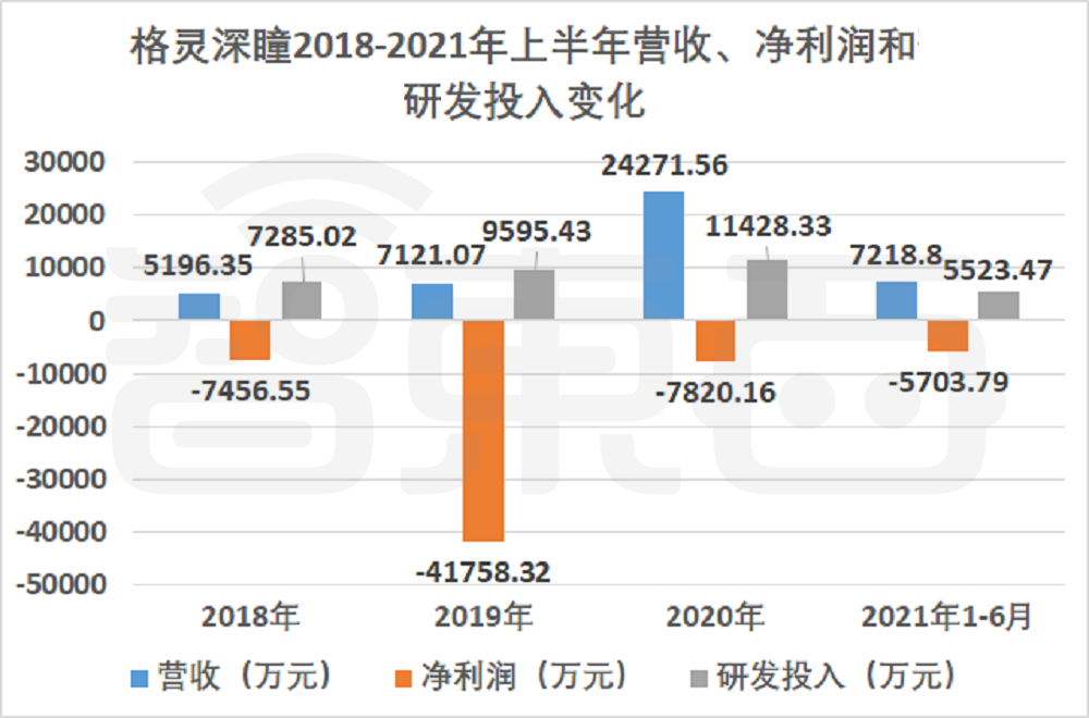 根据招股书,2018年、2019年、2020年格灵深瞳的营收分别5196.35万元、7121.07万元和24271.56万元,复合增长率达到116.12%,尤其是2020年营收增长尤其明显。2021年上半年,格灵深瞳营收为7218.80万元。
