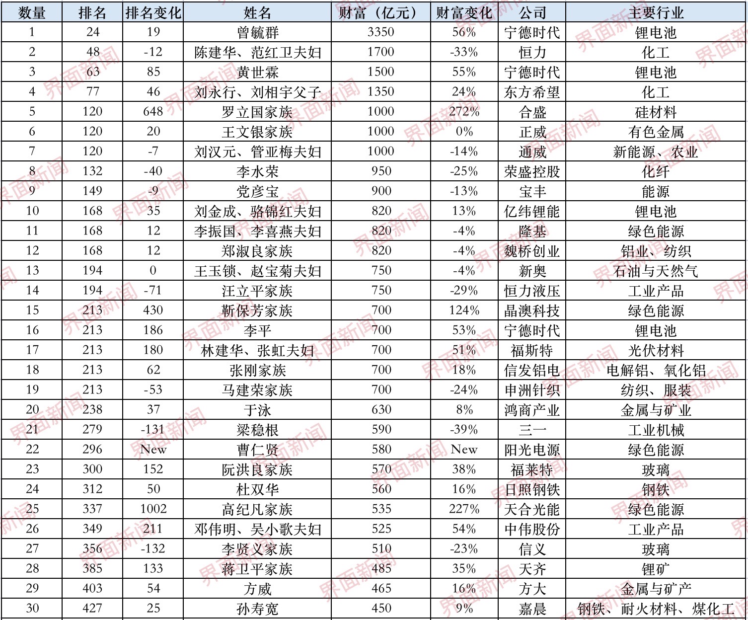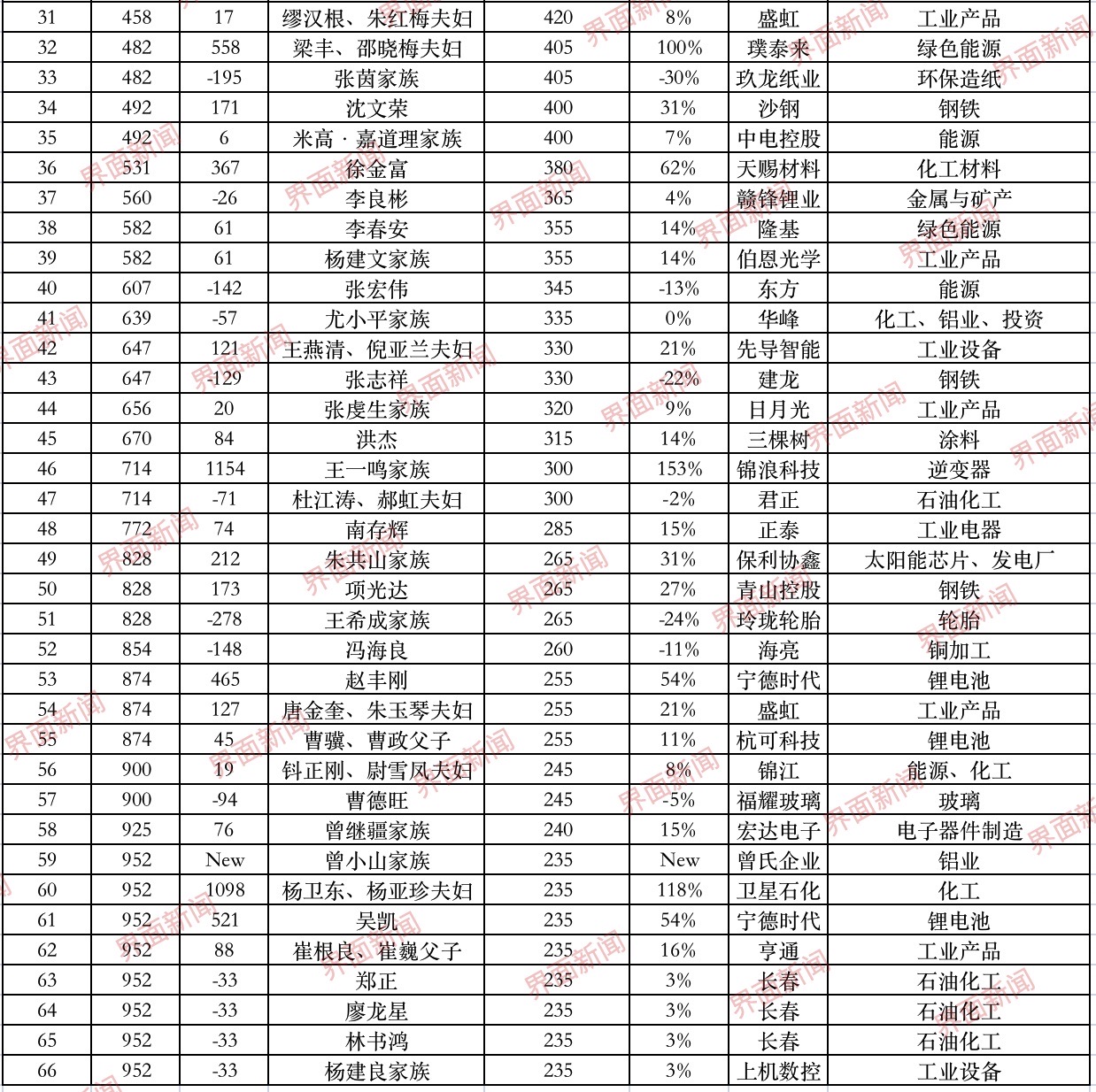 此外,璞泰来(603659.SH)的梁丰、邵晓梅夫妇排名较去年上升了558位;晶澳科技(002459.SZ)的靳保芳家族排名较去年上升了430位;保利协鑫(03800.HK)的朱共山家族排名较去年上升了212位;福斯特(603806.SH)的林建华、张虹夫妇排名上升了180位。
