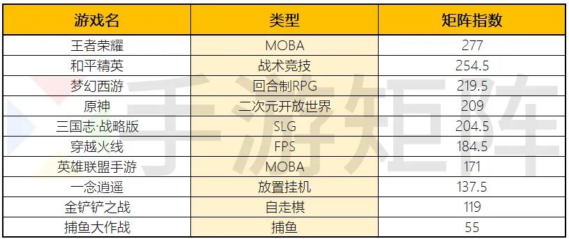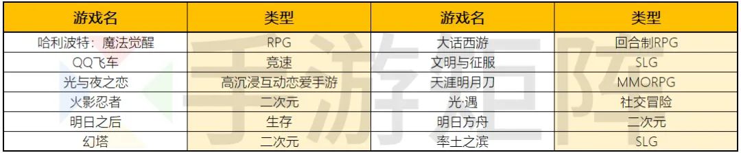 除此之外,其余还有12款游戏也曾登陆过TOP 10,如下图所示: