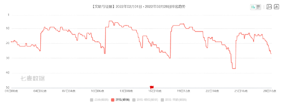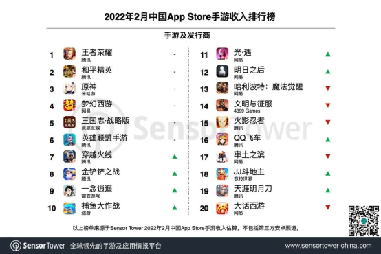 手游矩阵根据七麦数据的榜单信息整理了2022年2月份iOS收入的Top名单,如下图所示: