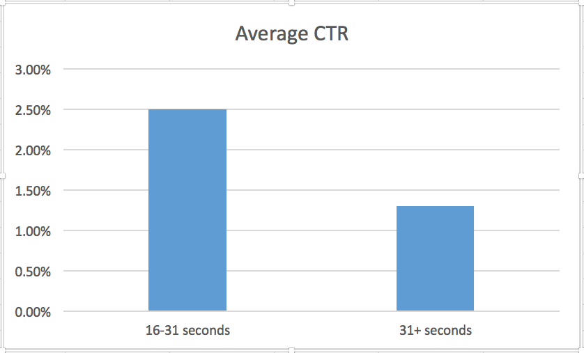 而非常有趣的一点是,移动营销协会和其合作伙伴在近期发布的研究中表明,尽管视频广告的播放时长并不会对浏览量造成非常大的影响,但却在很大程度上降低了CTR——持续时间越长的视频,其点击量越低。