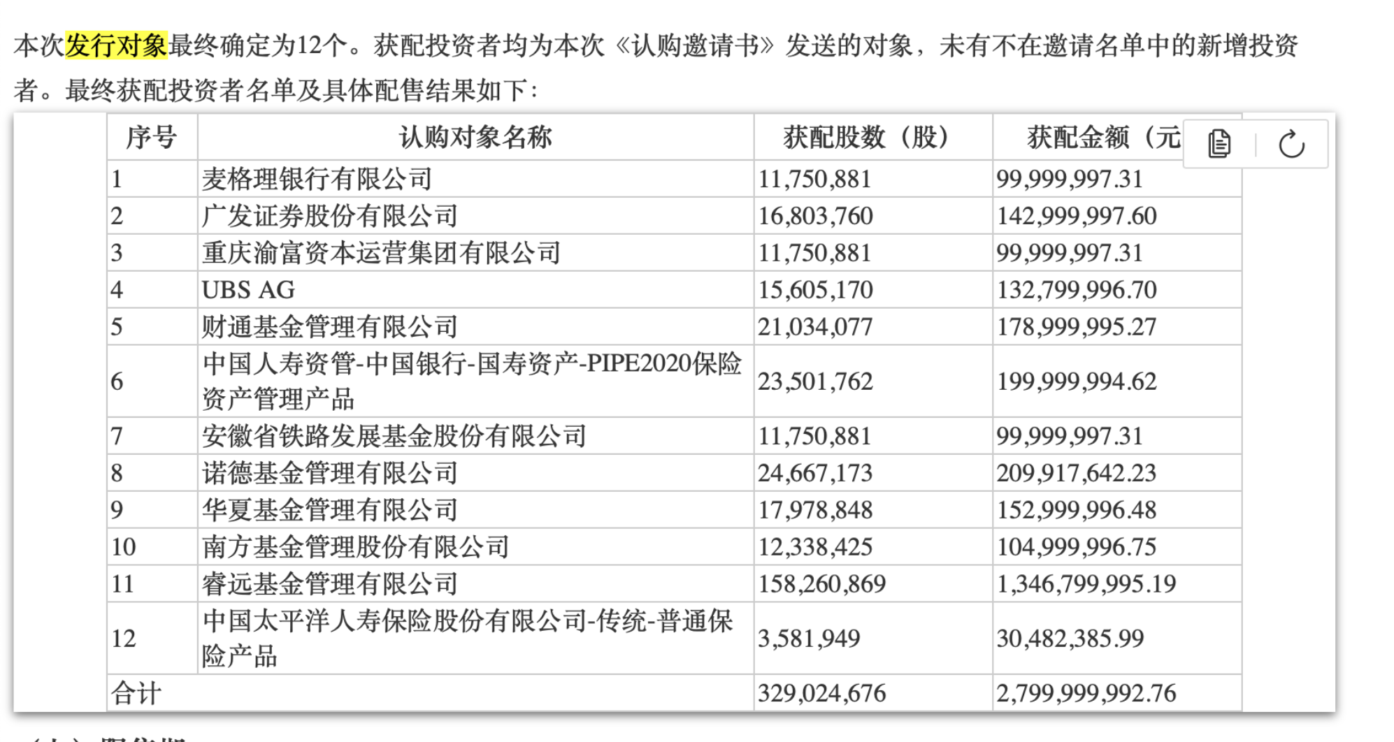 最终诺德基金以2.1亿元认购2467万股,财通基金花费1.79亿元认购2103万股,华夏、南方基金也分别斥资1.53亿元、1.05亿元各自认购1798万股、1234万股。