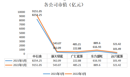 通过整理中石油、新天绿色能源股份有限公司(以下简称“新天绿能”,SH:600956)、广汇能源股份有限公司(以下简称“广汇能源”,SH:600256)、江苏东方盛虹股份有限公司(以下简称“东方盛虹”,SZ:000301)、内蒙古远兴能源股份有限公司(以下简称“远兴能源 ”,SZ:000683)2021年3月到2022年3月的市值数据,可发现,这几家企业都进行了质的飞升,其中,中石油更是增长896.8亿元。