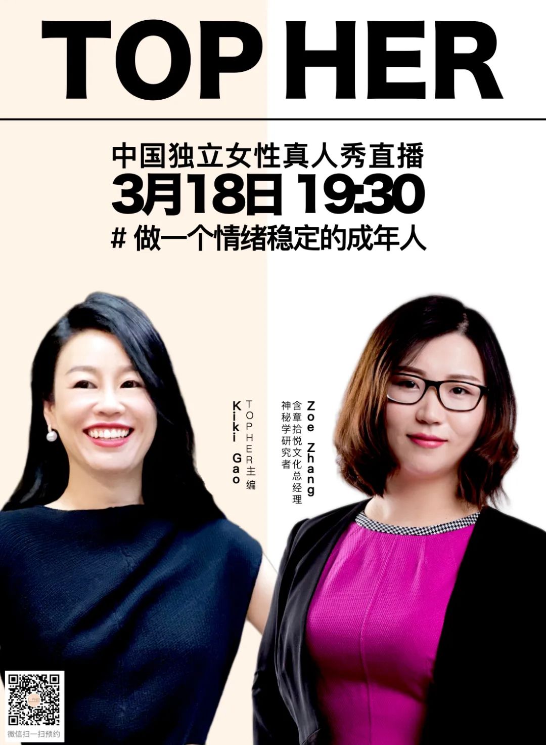 本期TOPHER直播,含章拾悦文化总经理Zoe Zhang将为大家讲述作为女性创业者所面临的艰难与机遇,以及教会人们如何避免职场情绪化。同时,创业者身份之外,她还将分享身为神秘学研究者的种种奇趣经验。