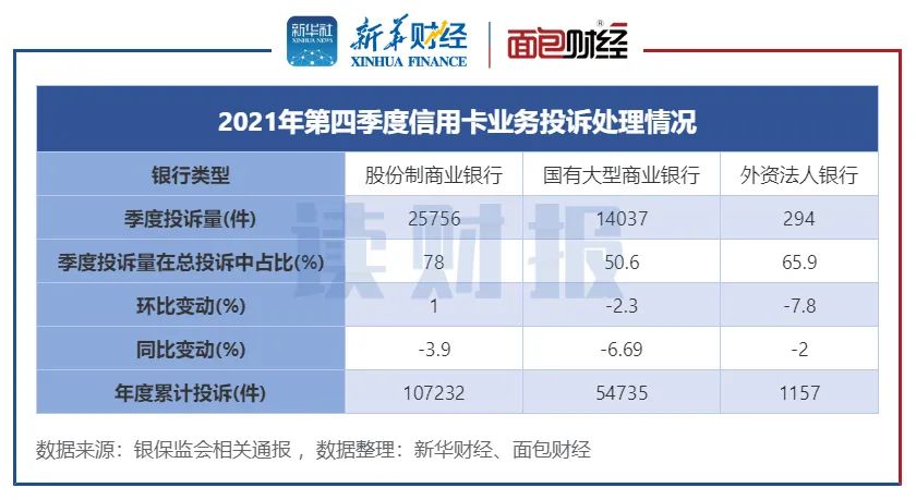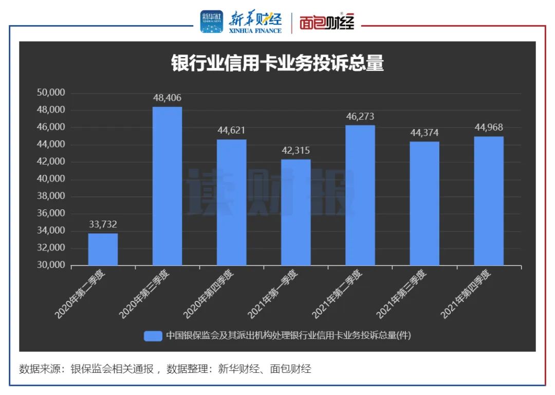 中国银保监会消费者权益保护局公布的数据显示,2021年银保监累计处理信用卡业务投诉超17万件。其中,2021年第四季度处理信用卡业务消费投诉44968件,较第三季度环比上升1.3%。