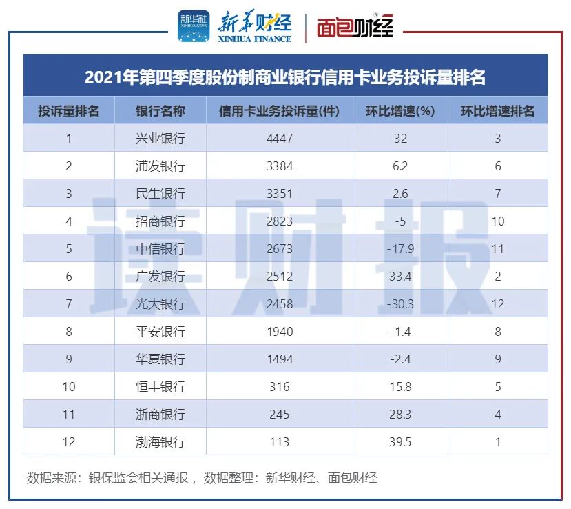 2021年第四季度,兴业银行、浦发银行和民生银行的信用卡业务投诉量位居股份制银行前三名。其中,兴业银行第四季度信用卡业务投诉量达到4447件,是唯一单季信用卡业务投诉量超过4000件的股份制银行。