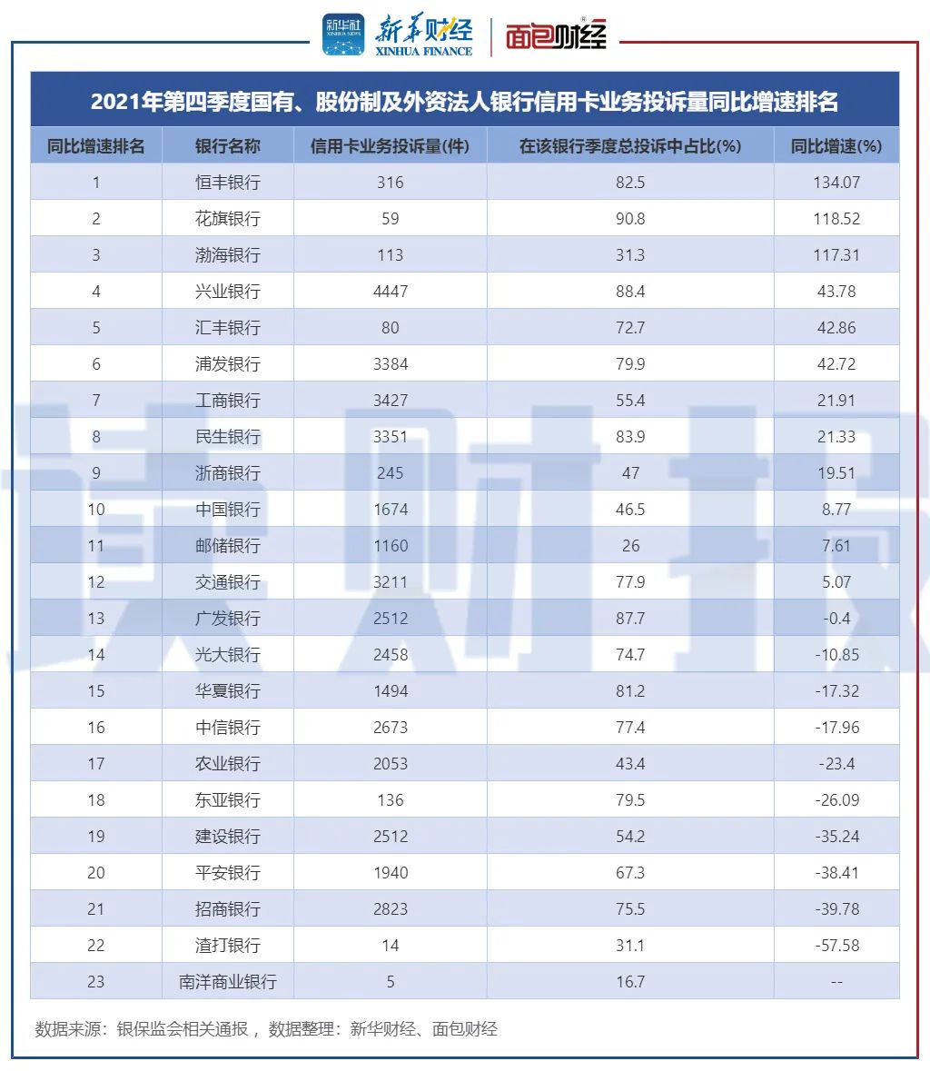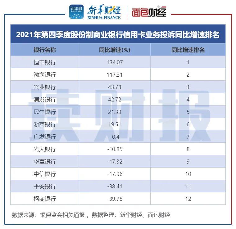 从2021年第四季度的同比增速来看,恒丰银行和渤海银行位居股份制银行前两位。但是,这主要是由于两家银行去年基数较低造成。即便在翻倍增长之后,2021年四季度两家银行的信用卡业务投诉量合计仍不超过500件。